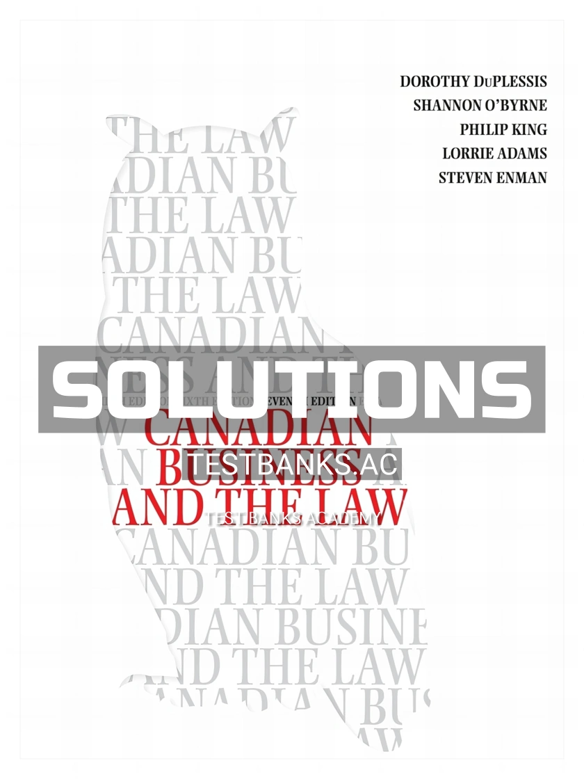 Complete solutions manual for canadian business and the law, 7th ca edition by duplessis, obyrne, king, adams, enman (cengage 2020 9780176795085-isbn) All chapters are included.
