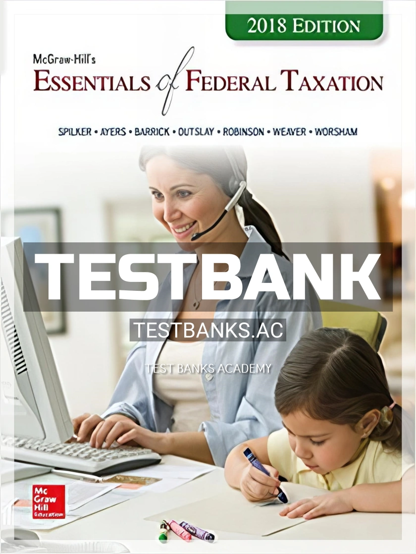 Complete test bank for essentials of federal taxation 2018 edition, 9th edition by spilker, ayers, barrick, outslay (mcgraw-hill 2018 9781260007640-isbn) All chapters are included.